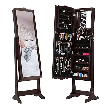 Langria Mirror Jewelry Armoire Cabinet Free Standing Jewelry Organizer With 10 Leds 5 Shelves Additional Mirror Inside Brown